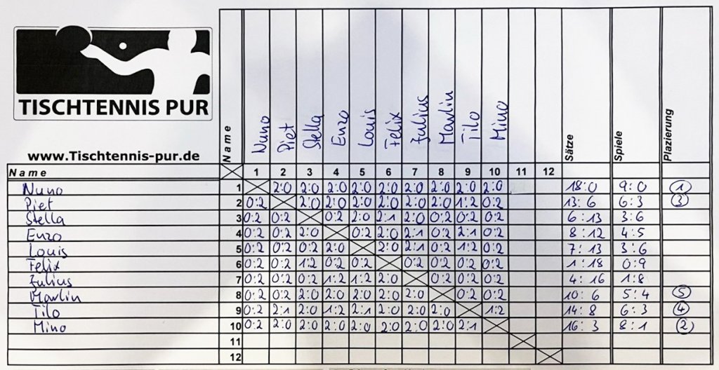 Platz 3 erkämpfte sich Piet und sicherte sich damit auch eine Trophäe für’s heimische Regal. Wir wünschen ihm und allen anderen, dass in der weiteren Tischtenniskarriere noch etliche Auszeichungen hinzukommen.